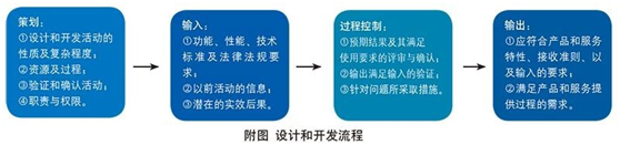 組織應建立、實施和保持設計和開發(fā)的策劃、輸入、過程控制、輸出以及更改的過程,確保后續(xù)的產(chǎn)品和服務的提供。在設計和開發(fā)的各個控制階段,主要考慮設計和開發(fā)活動的性質(zhì)、產(chǎn)品和服務的具體類型、輸出滿足輸入的要求、提供產(chǎn)品和服務過程的需求,設計和開發(fā)流程見附圖。